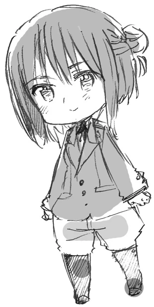 Nosi białą koszulę z zawiązaną na kołnierzu niebieską wstążką. Do tego ma jasnobrązową kamizelkę. Zazwyczaj przedstawiana jest w spodniach i butach sięgających do kolan.