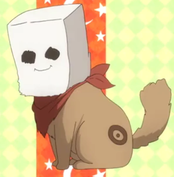 Jego sierść jest jasnobrązowa. Na swoim boku posiada ciemną łatkę w kształcie nazar. Ma puszysty ogon oraz białą torbę z kółeczkami na oczy oraz dorysowanym uśmiechem, co ma symbolizować maskę, którą nosi jego właściciel. Nie wiadomo jak wygląda jego twarz. Chociaż szkice Himaruyi przedstawiają go bez przedniej lewej nogi, w anime już ją posiada. Na szyi nosi czerwoną chustkę. Fani spekulują, że jego rasa to prawdopodobnie angora turecka lub turecki van.