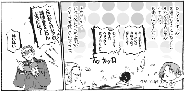 Адольф Гитлер является "боссом Германии" во время Второй Мировой. Впервые он появился в 4 главе манги "Стальной пакт", где вместе с Германией готовятся к встрече с Россией. Германия, позже, рассказывает Финляндии о том, как Гитлер заставил его искать Святой Грааль. Финляндия спрашивает, беспокоит ли Германию то, что его босс может бросить его в тюрьму за жалобы, и, в то время как Германия выражает свои сомнения, Финляндия делает вывод о том, что босс Германии может предсказуемо зайти так далеко.