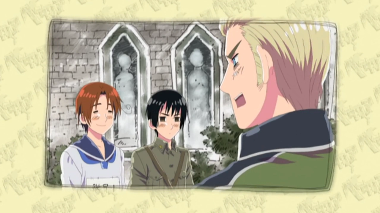 - «Япония Vs. Италия» первоначально происходила до фрегмента «Германии Vs. Италия», а также Италии поцеловал Японию вместе объятий, что побудило Японию требовать, чтобы он взял на себя ответственность и вышел за него замуж.