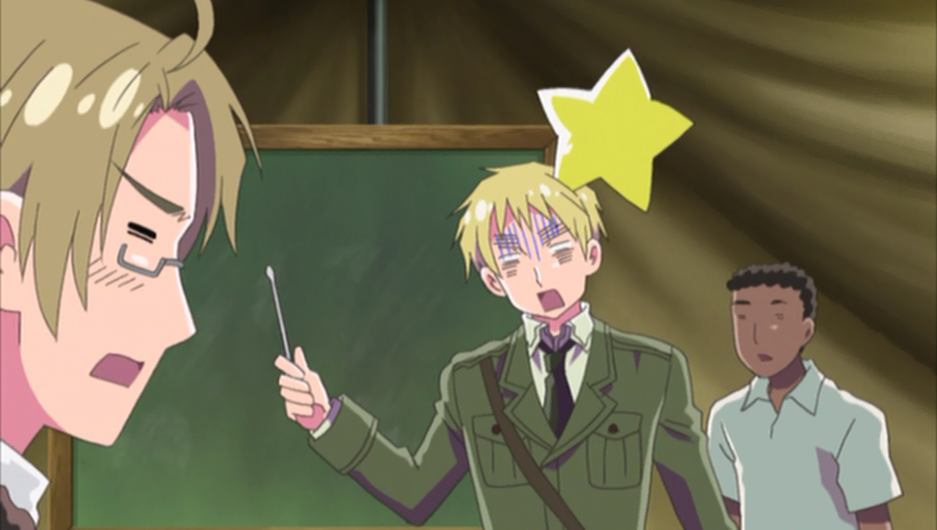 Звезда, в буквальном смысле, падает, говоря, что она не исполнит столько желаний. Звезда падает прямо на голову Англии, который выкладывал план действий на завтра. После чего, Америка, радостно начинает спрашивать, что это у него на голове, добавляя, что он выглядит круто.