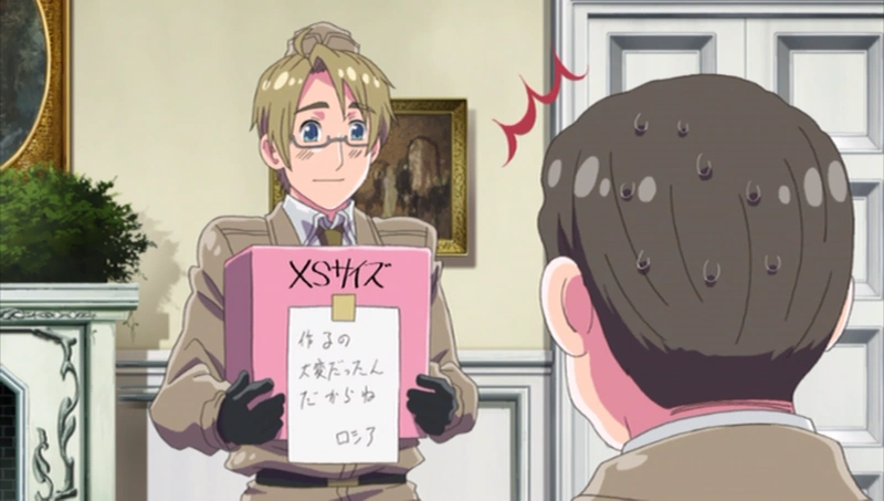 - В тизере, после серии первоначально была иллюстрацией омаке к первой полосе и была нарисована как шутка о том, как Америка и Италия оба kuuki yomenai (空気読めない) или "KY", который является сленгом для тех, кто не может «читать настроение / атмосферу», кто-то, кто не может понять чужие чувства, ситуацию и действует / говорит неправильно.