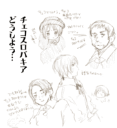 Originally, only one character for Czechoslovakia (チェコスロバキア Chekosurobakia?) was planned, with a possible design being that of a young girl (as Himaruya felt "Cheko" sounded feminine), while another was of a bearded man (as he felt Slovakia made the name masculine). Two other designs for the character were shown, one being a "musician"-looking character (who resembled Iceland), and another clean-shaven younger man who was a "ladies' man" (based off of a Slovakian classmate of Himaruya's). He would state that he was thinking about creating the character as a "tough brother" or "tough brothers".