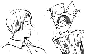 - ↑ Whether or not he actually physically is the youngest is unknown, because in a bonus comic posted on Himaruya's Twitter (Japanese; English), it is shown that England and his brothers decided that England would refer to them all as "big brother" in exchange for him representing the whole UK at meetings, regardless of whatever their actual physical ages are.