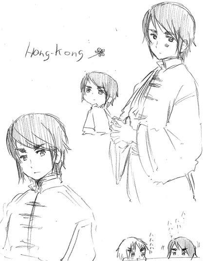 - In a short comic, Hong Kong is shown to have long hair and a low ponytail as a child. He also has a more gentle and shy face than he does now.