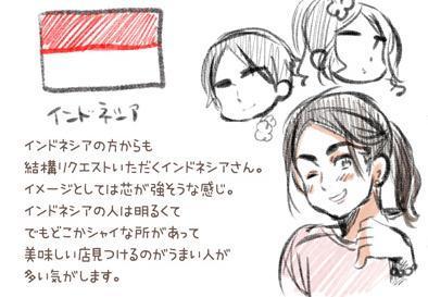 - Years before his final design got released, Himaruya created a sketch of a person with an Indonesian flag and a note saying "I've received a lot of request from Indonesian fans to draw Indonesia-san. I see Indonesia as a strong-willed person. Indonesian are cheerful but also shy at some point; i feel like there are a many Indonesian who are good at finding places with delicious food. However, Himaruya had revealed that the sketch was not a design for Indonesia, but of a person he had met there, this has caused a misunderstanding among the fans for a long time.