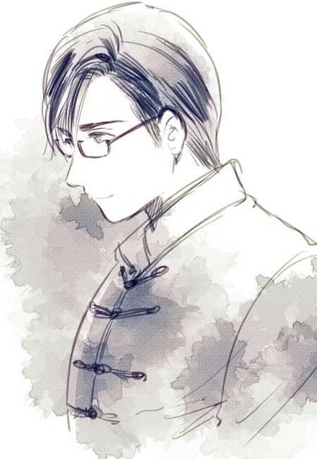 In an early sketch, he is depicted with a wider jaw and wearing a duangua with over-sized sleeves and without trim.