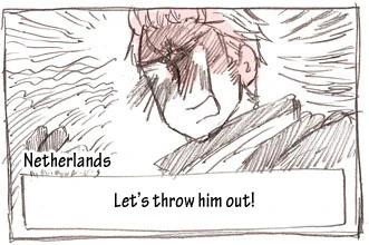 Japan: Though Netherlands acted aggressive towards most others, he refrained from acting this way towards Japan to convince him to open trade with foreigners, due to having had a companionship with him for years before his isolation. Also, in the Netherlands and Isolationist!Japan comic, it is shown that Netherlands is visibly bothered by the fact that Japan signed a peace treaty with America.