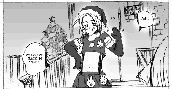 He later appears in the deleted follow-up to the Christmas 2007 Comic[17], wearing a skimpy Santa-style outfit. It consists of a Santa hat, gloves that go past the elbow with white fur trim, a crop top with a white rabbit-head accent and a white pom-pom, and suspenders attached to a skirt with two rabbit-heads on it. It can be assumed that the entire outfit is red and white, to go with the Christmas theme.