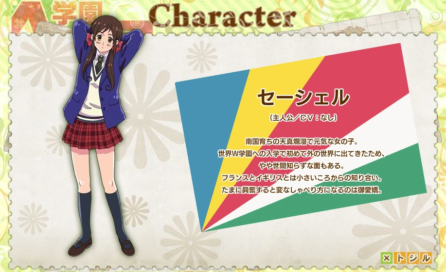 In her Gakuen Hetalia appearance, she fears attending a new academy because she lacks talent and confidence. She claims to have once been rich and strong, but has become poor and useless. Seychelles believes that her only abilities are to sing, dance, and make souvenirs. Seychelles is conflicted over her feelings for both France and England; the former raised her and makes sexual advances, while the latter is aggressive and dominant. Seychelles does not have fond feelings for her coat of arms, and she is laughed at in her Africa class due to its outlandish appearance.