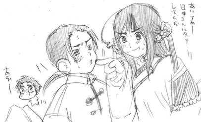 She called him a "teacher" in the drama CD, but called him a "bastard" in the previous sketch. An early illustration shows that she dislikes China and is more interested in Japan, she thinks that China should leave him alone. In the drama CD, she treats him in a slightly more friendly way, but still has very low patience for China's quirks.